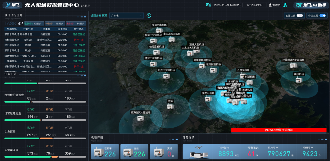 圳飞无人机机场管理平台是我司自主研发的低空服务标准化解决方案平台,可对无人机机场场站远程下发任务并自动化执行,深度整合AI算法与大数据分析能力,赋能数百种巡检场景,满足多元场景需求,通过部署无人机智能机场网络,提供城市精细化管理的空中巡查服务,涵盖城市管理、自然资源监管、应急消防、交通巡査、水务监测等 20 余类任务。目前圳飞平台已落地了广东、山东、重庆、广西、山西、陕西、河北、内蒙古等地,已部署机场200余台,服务于自然资源,公安,交警,应急,住建,水务等部门。通过“1+N+N”模式(1个平台调度多机场执行多任务)成功打造国内低空政务服务治理标杆样板,实现数字孪生底座数据更新、巡查巡检的自动化无人值守作业。