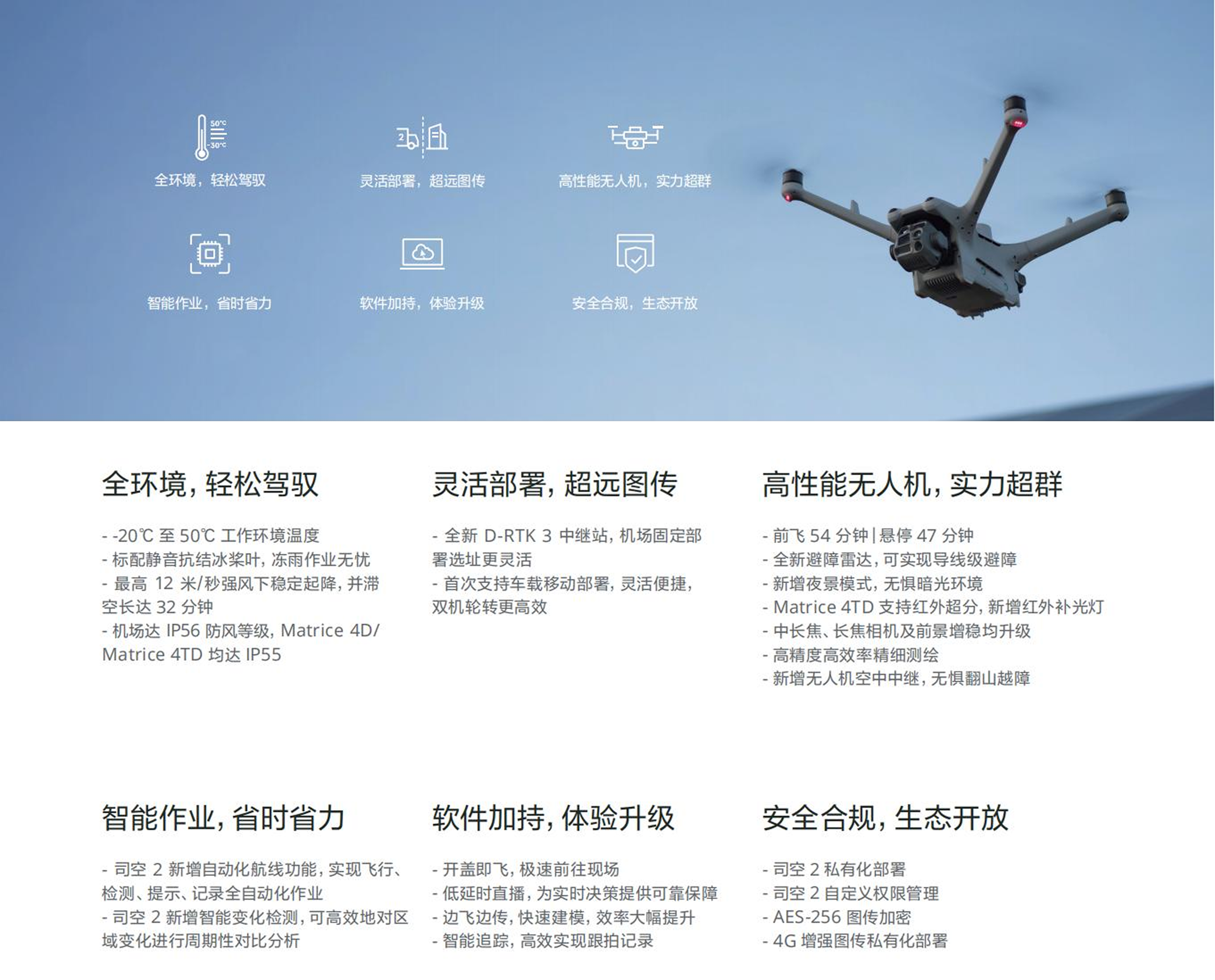 大疆机场 3 配备专有 Matrice 4D/Matrice 4TD 高性能无人机,赋能全天候、全场景无人值守作业,并首次支持车载移动部署,从容驾驭各种作业环境。无人机所搭载相机与 Matrice 4 系列一脉相承,且飞行及防护性能更佳,还可搭配 DJI RC Plus 2 行业版遥控器单独使用。通过大疆司空 2,结合全新智能功能,进一步节省作业时间和人力成本。