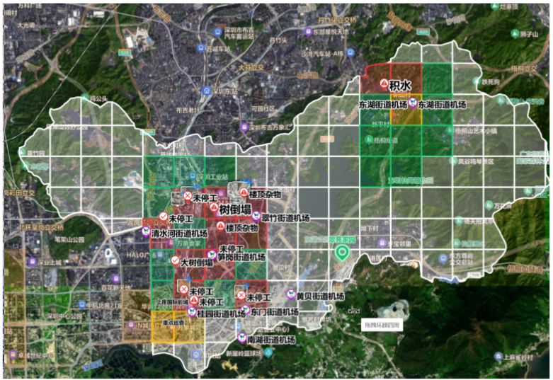 在台风到来前当天,利用天气相对稳定的窗口期,通过平台提前规划好的巡查路线与AI识别,结合机场与无人机设备的作业配合,对全区重点防控目标进行最后一轮“地毯式”筛查,14座无人机机场执行率100%,共计规划13条隐患巡检航线,出动无人机34架次,共计主动发现、定位、上报潜在风险点包括工地施工、高空坠物风险、楼顶设施物料未加固、塔吊未加固等安全隐患17个,为政府部门的提前介入和处置争取宝贵时间。